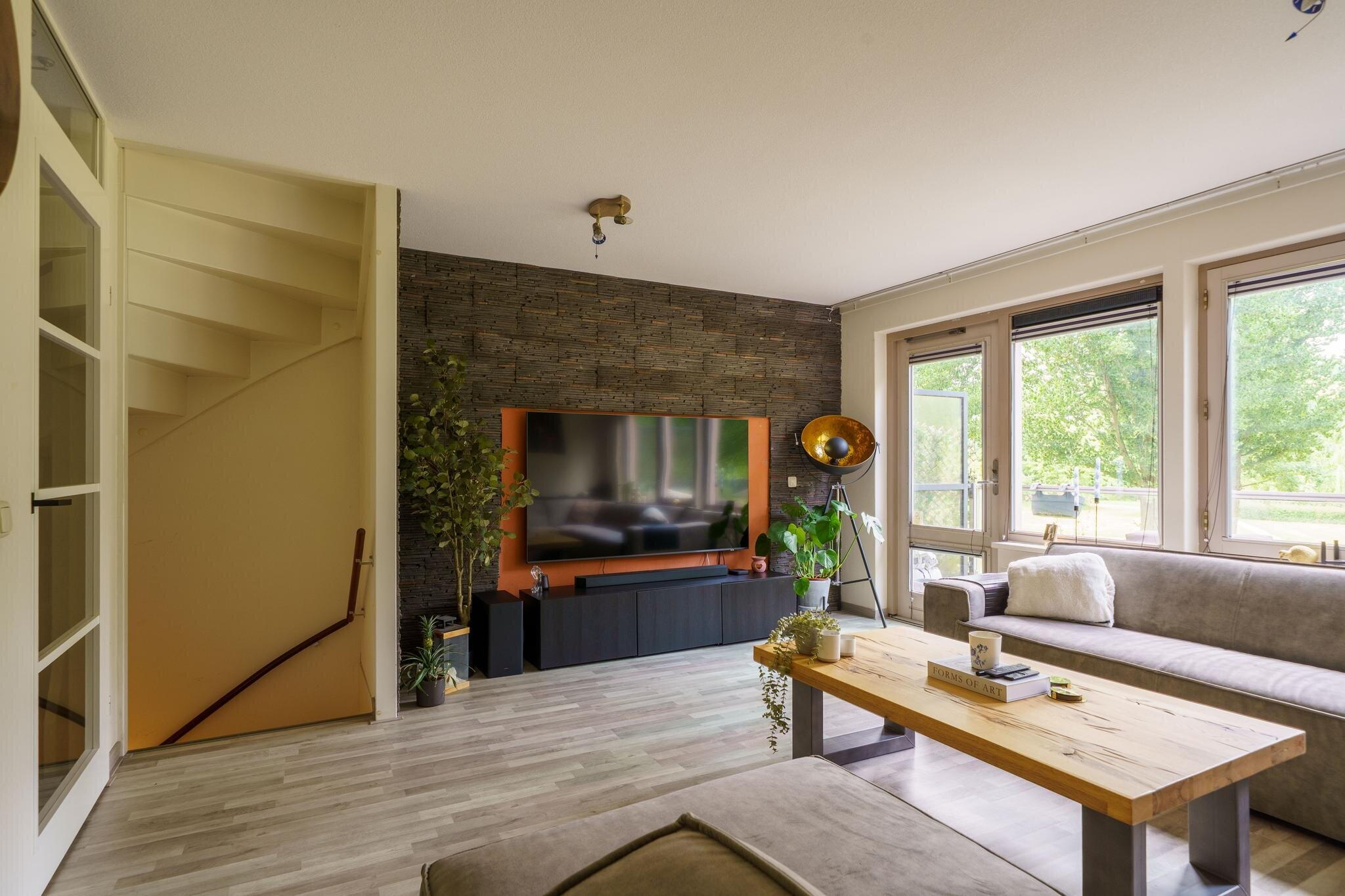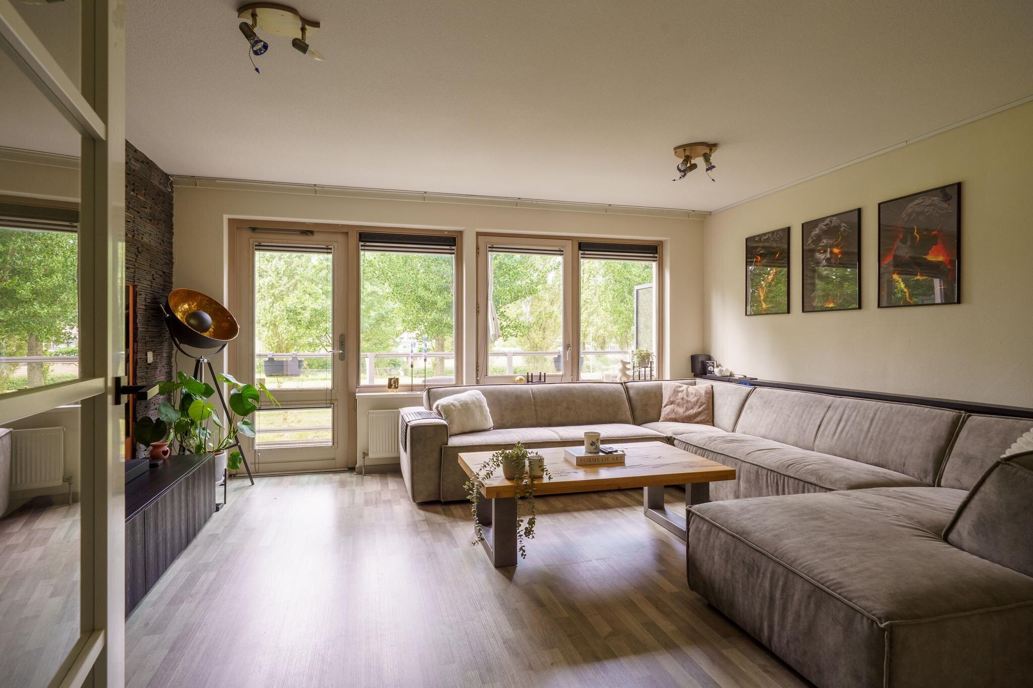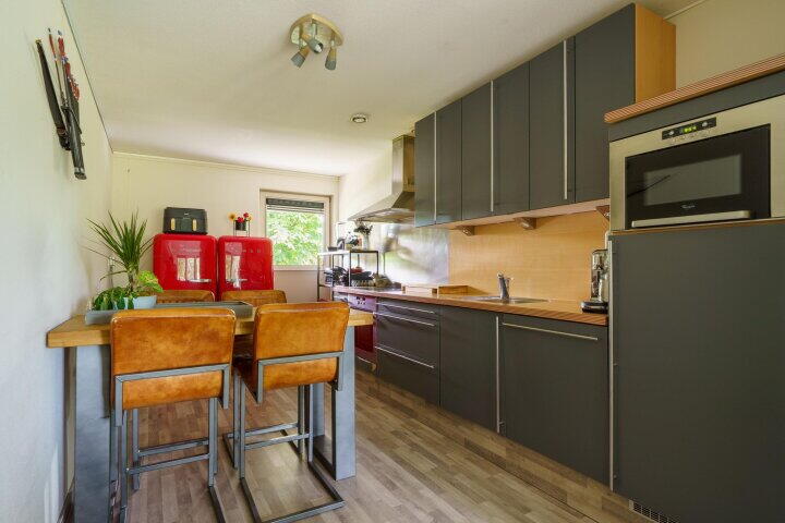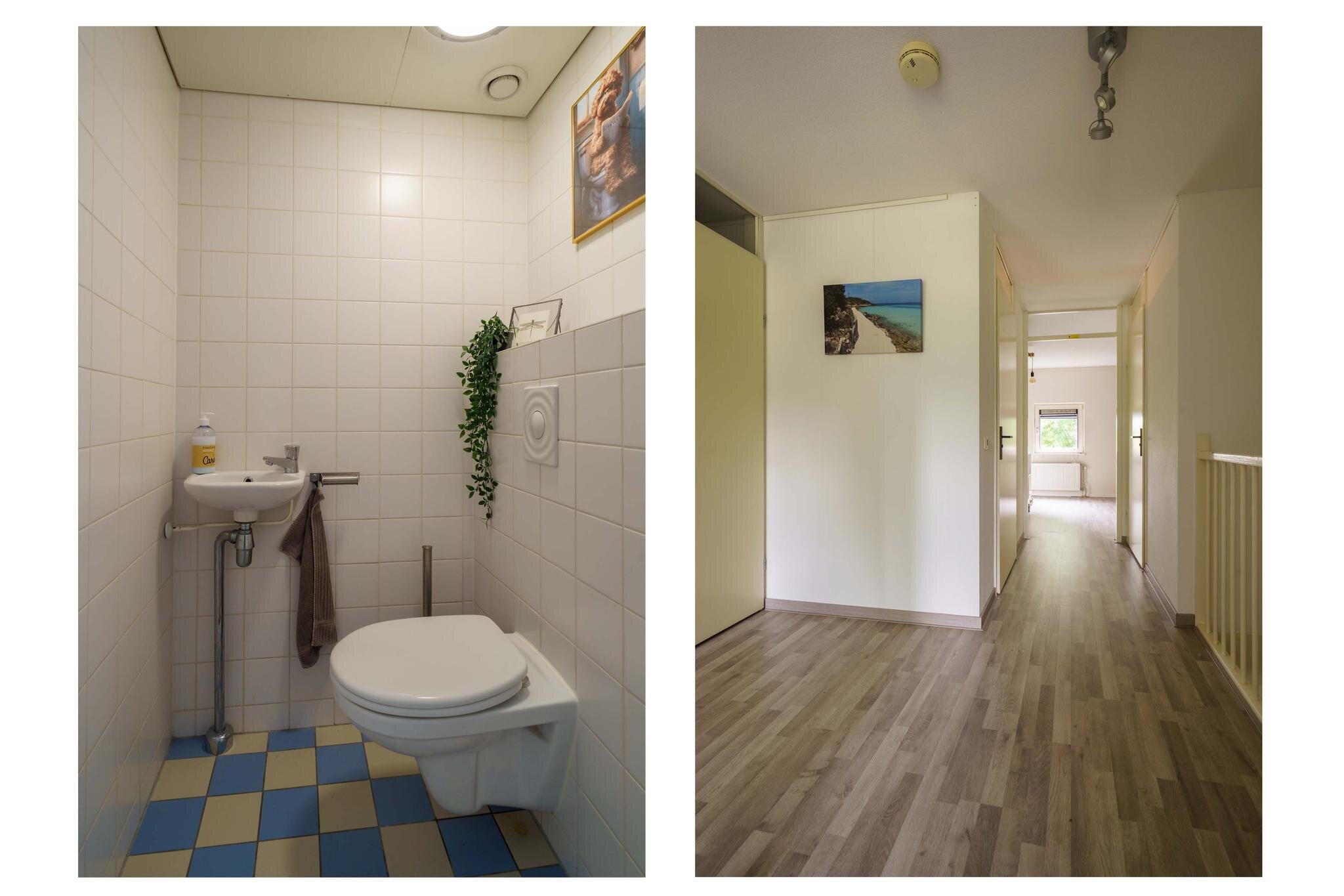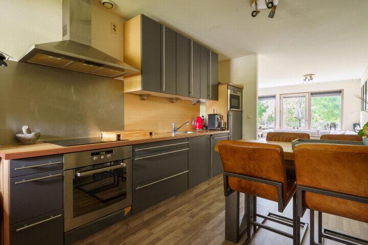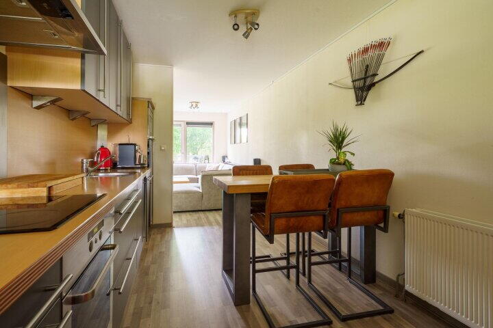 Ruime hal met meterkast, toilet (uitgevoerd met zwevend closet en fonteintje) en toegang tot de ruime woonkamer met fantastisch uitzicht over groen en water. Vanuit de woonkamer heeft u toegang tot het ruime balkon op het zuidwesten. De keuken bevindt zich aan de voorzijde en is uitgevoerd met een inbouwkeuken in rechte opstelling v.v. diverse apparatuur wo. een magnetron, oven, vaatwasser, keramische kookplaat en afzuigschouw (recirculatie). De vloeren in het gehele appartement zijn v.v. laminaat en de wanden zijn afgewerkt met spuitwerk. Via de trap in de hal bereikt u de tweede verdieping. Er is in de woonkamer tevens een trap naar de begane grond.