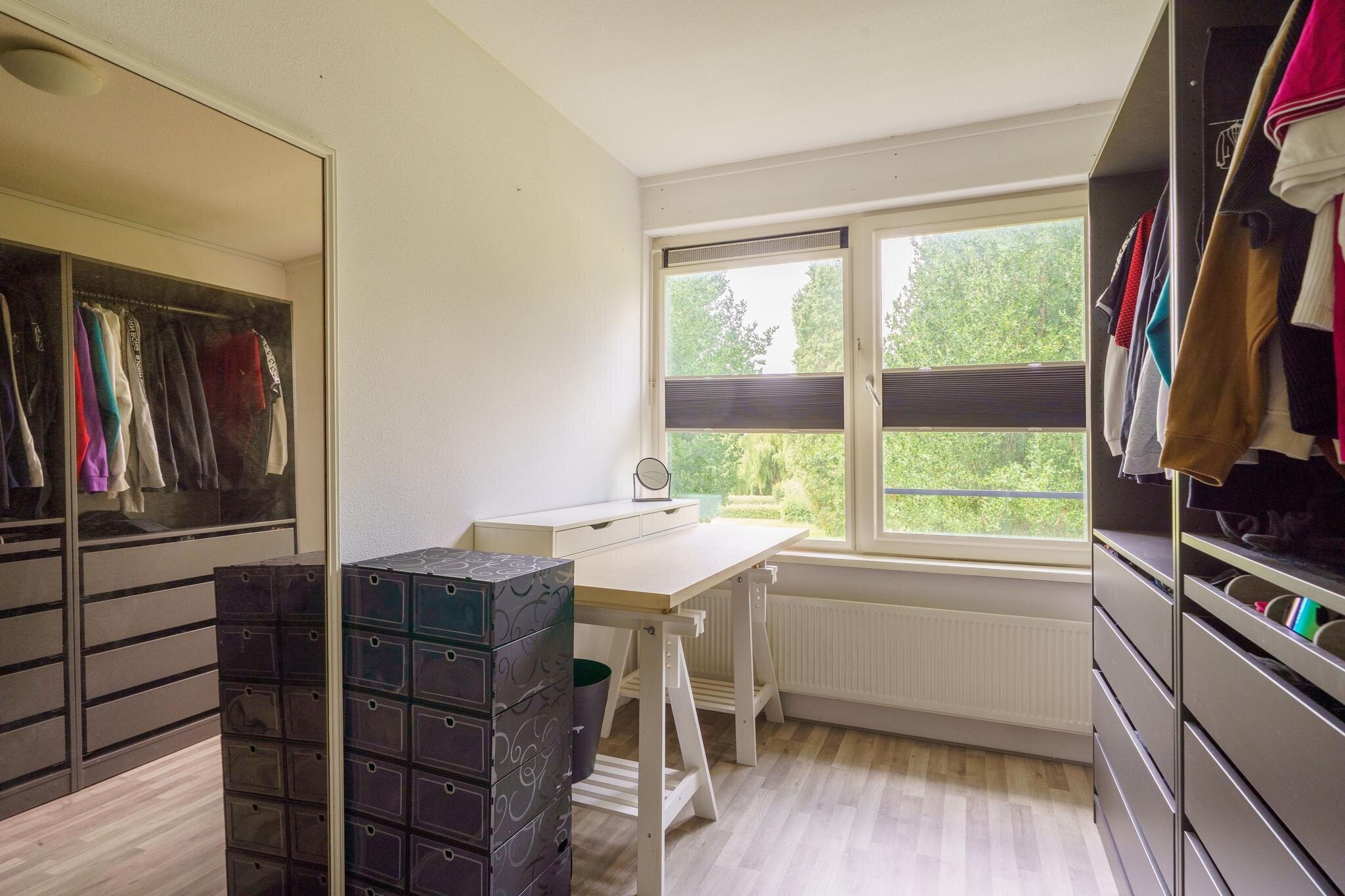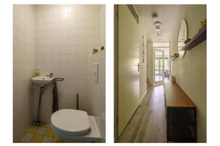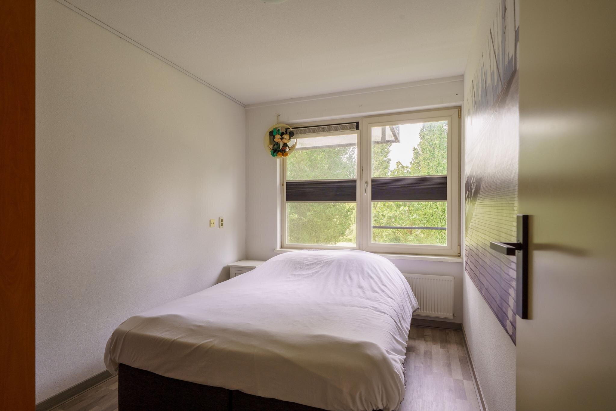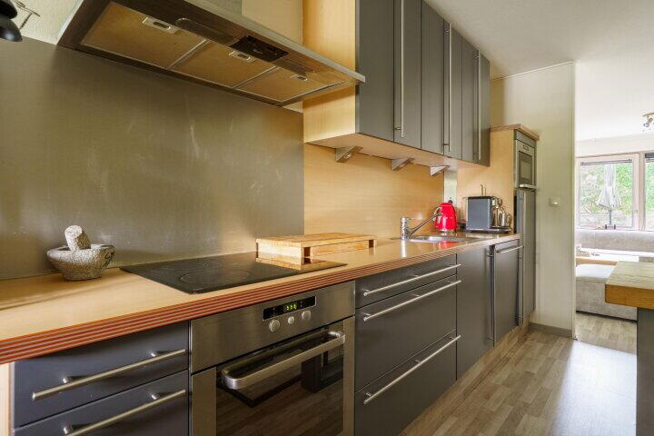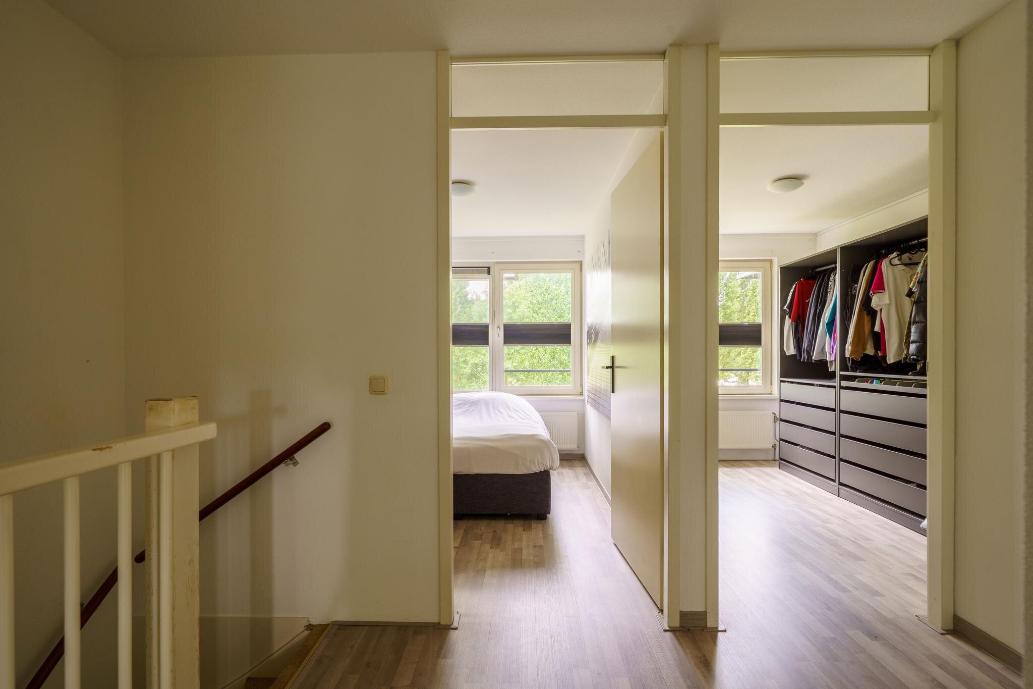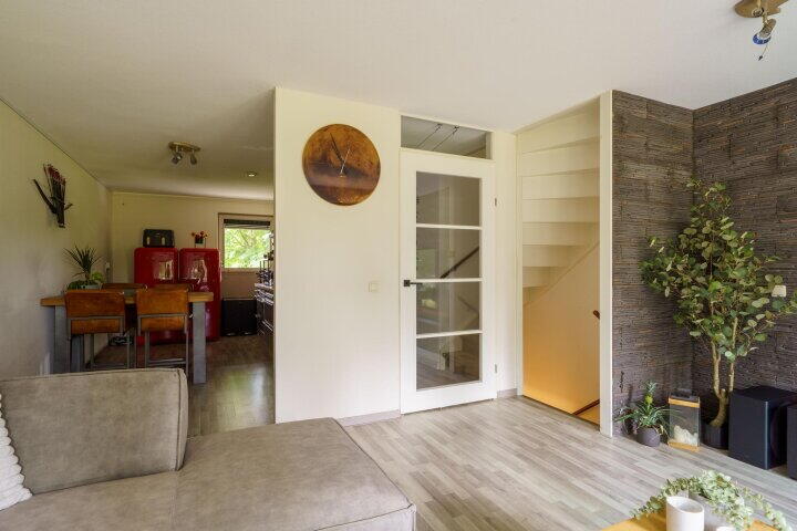 Ruime hal met meterkast, toilet (uitgevoerd met zwevend closet en fonteintje) en toegang tot de ruime woonkamer met fantastisch uitzicht over groen en water. Vanuit de woonkamer heeft u toegang tot het ruime balkon op het zuidwesten. De keuken bevindt zich aan de voorzijde en is uitgevoerd met een inbouwkeuken in rechte opstelling v.v. diverse apparatuur wo. een magnetron, oven, vaatwasser, keramische kookplaat en afzuigschouw (recirculatie). De vloeren in het gehele appartement zijn v.v. laminaat en de wanden zijn afgewerkt met spuitwerk. Via de trap in de hal bereikt u de tweede verdieping. Er is in de woonkamer tevens een trap naar de begane grond.